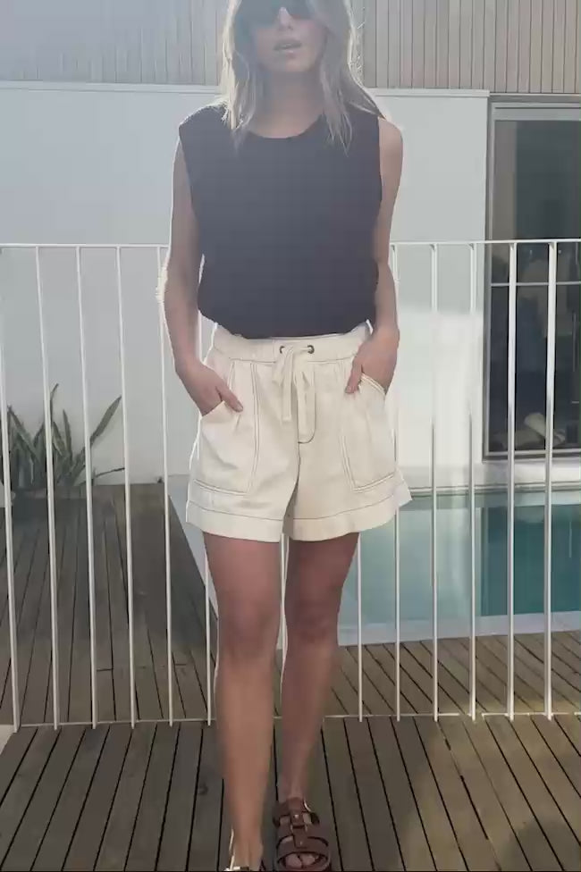One of our best selling short styles! The Relaxed everyday short is defined by a slouchy fit with wide leg, mid thigh length, elasticated waistband with drawcord, pleats at front pocket, a soft drape, deep hem and finished with heavy weight top stitching.