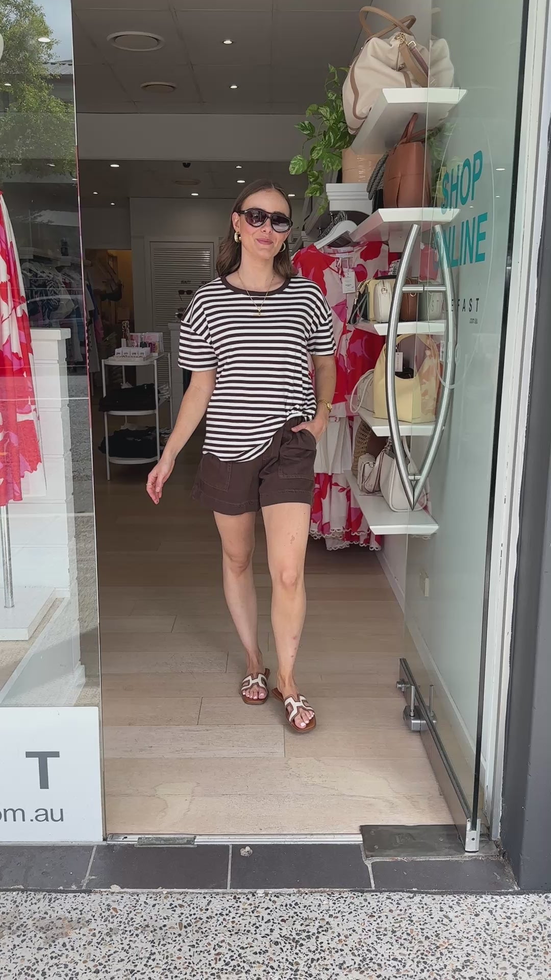 The easiest t shirt design has entered the chat... Jessie is a classic boyfriend tee in a versatile chocolate stripe colour way. Her main feature is her easy tuck design on the left side. This tee is a must have wardrobe essential!